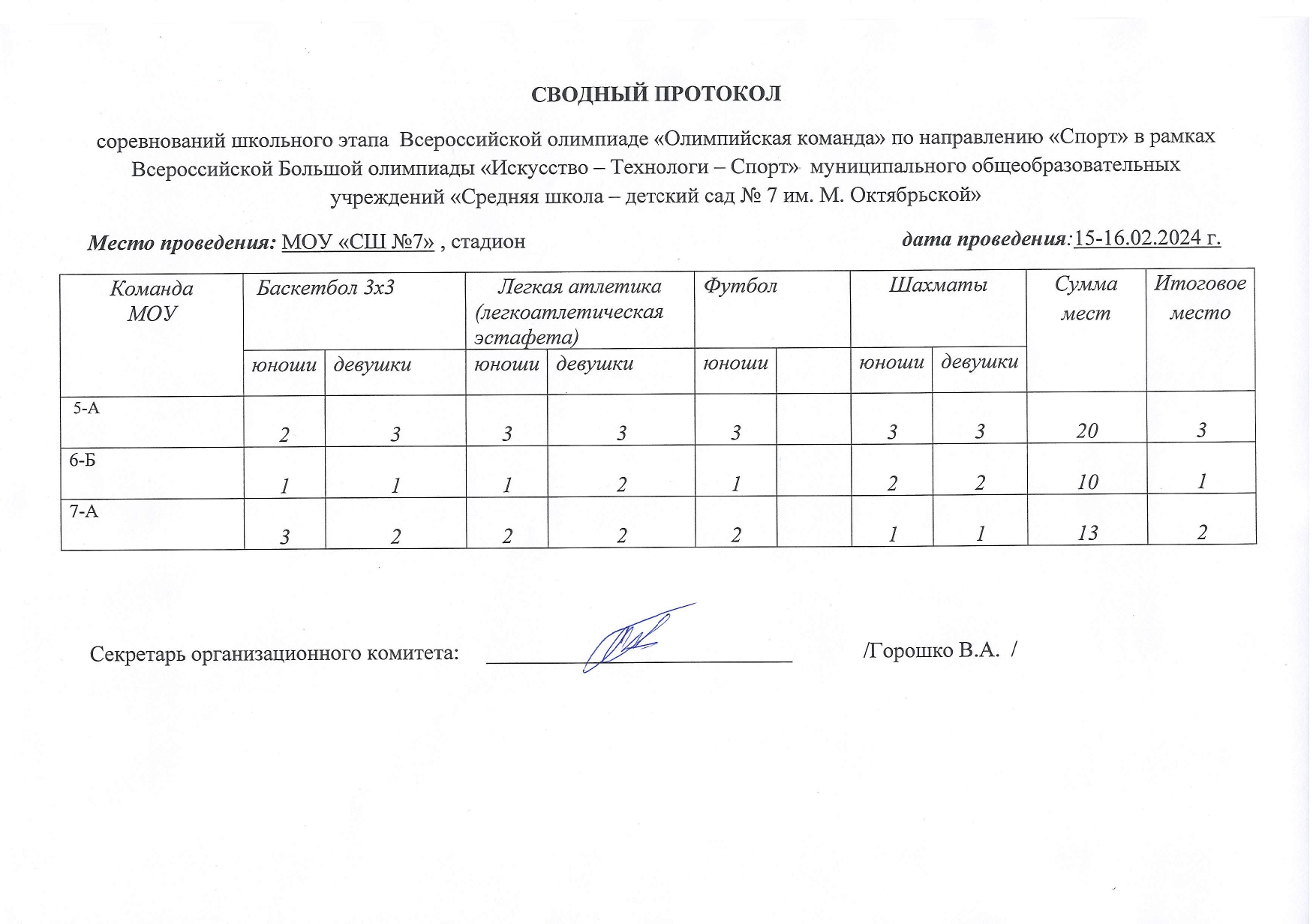 Приняло участие 40 обучающихся. Программа школьного этапа состояла из баскетбола, легкая атлетика, футбол, шахмат.